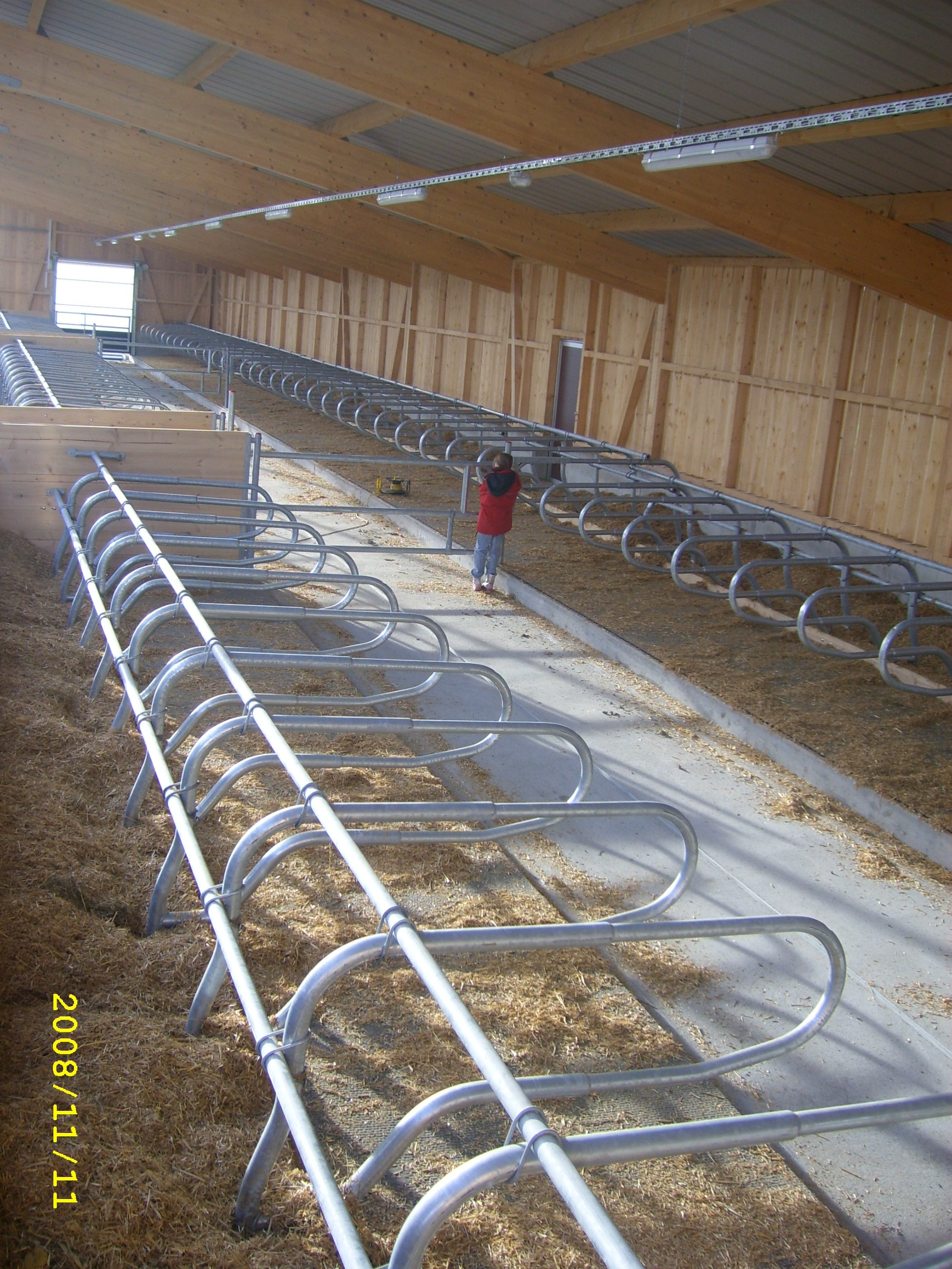 Die Tiere liegen auf einer BTS-konformen Rollenmatte, eingestreut mit Strohhäcksel. Entmistet wird mit einem Schieber.